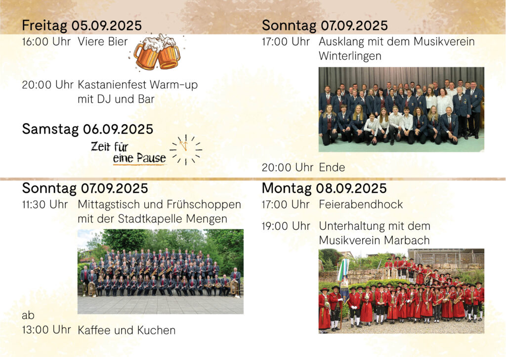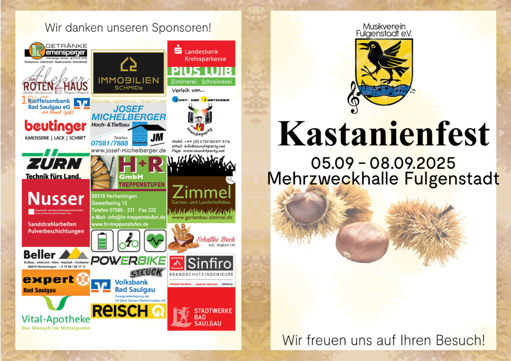 Auch in diesem Jahr laden wir – der Musikverein Fulgenstadt e.V. – zum Kastanienfest ein. Wir freuen uns auf drei Tage voller Musik, Geselligkeit und Leckerein. Von Freitag bis Montag wird in der Mehrzweckhalle in Fulgenstadt gemeinsam gefeiert – ein Fest für Jung und Alt!