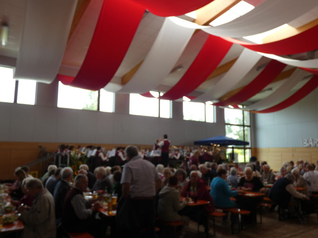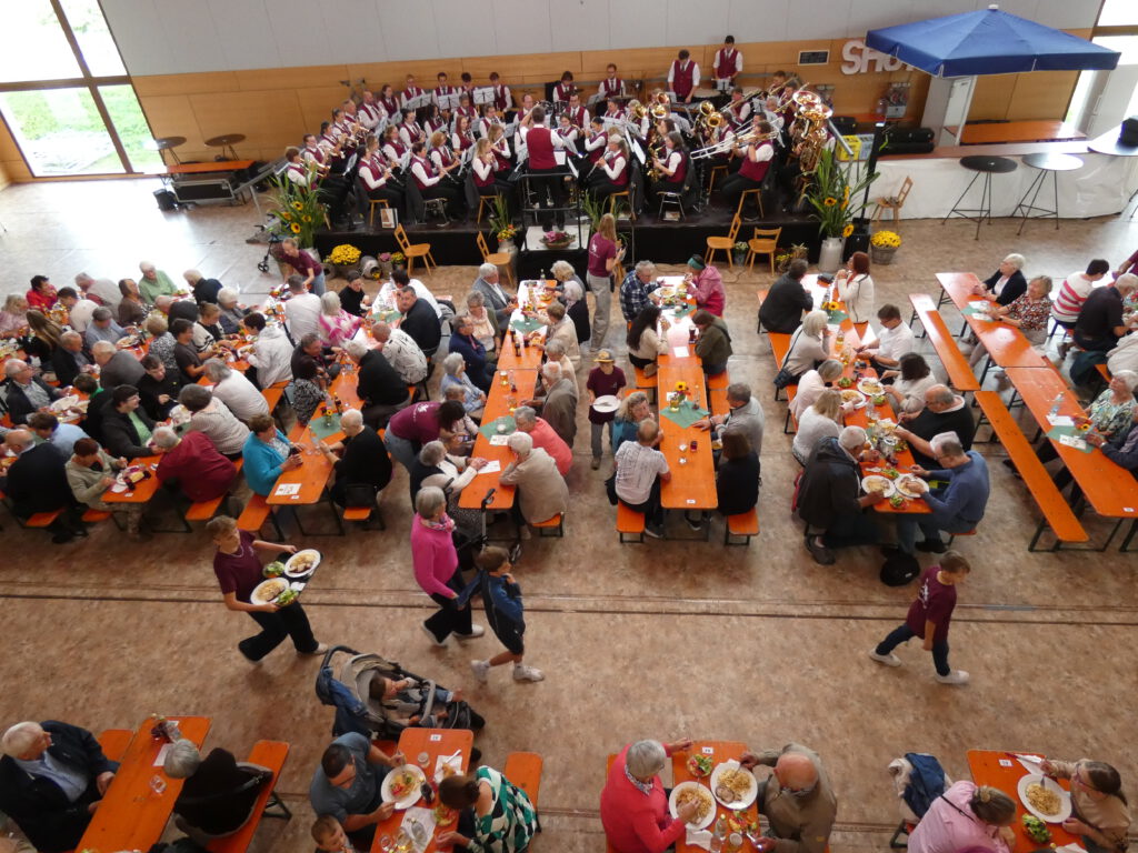 Das Highlight war wie immer der Sonntag Mittag. Zum Mittagstisch war die Halle ebenso wie der Außenbereich der Halle bis auf den letzten Platz gefüllt. Die Stadtkapelle Mengen sorgte für ein musikalisches Erlebnis der Extraklasse – die Bühne war so voll wie nie zuvor. Spießbraten und Salate kamen bei allen super an und auch für kühle Getränke jeglicher Art haben wir gesorgt.
